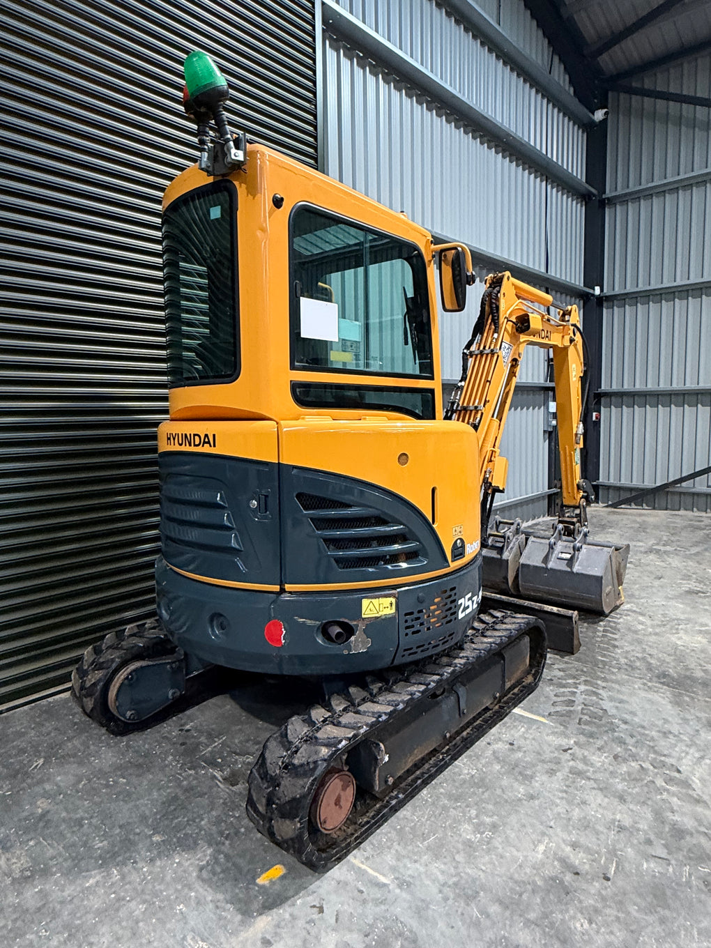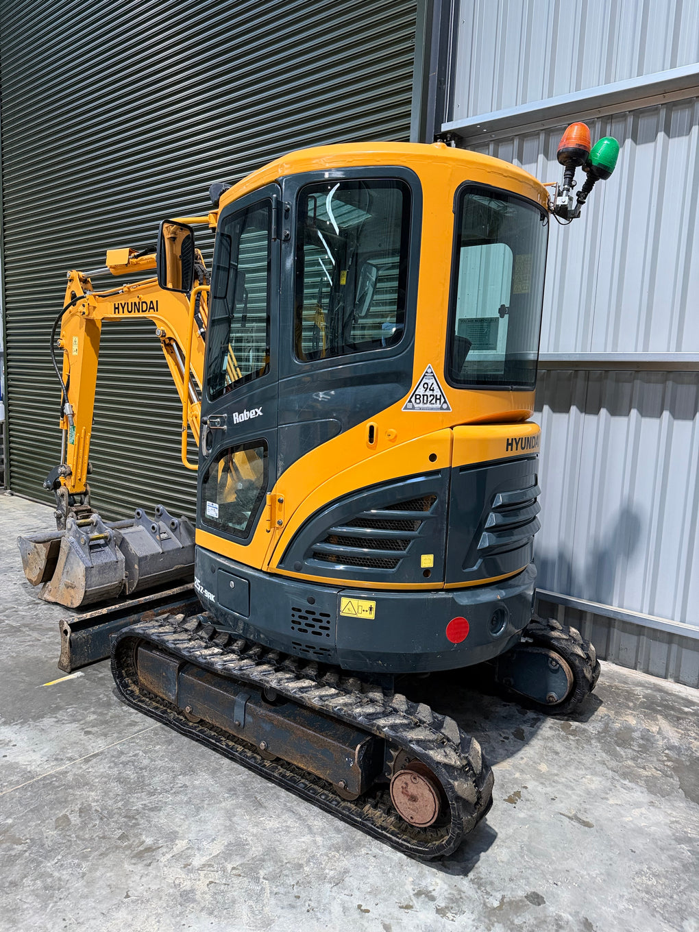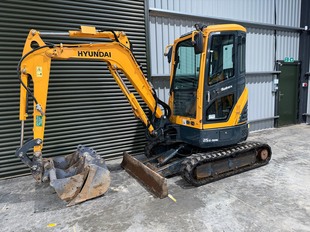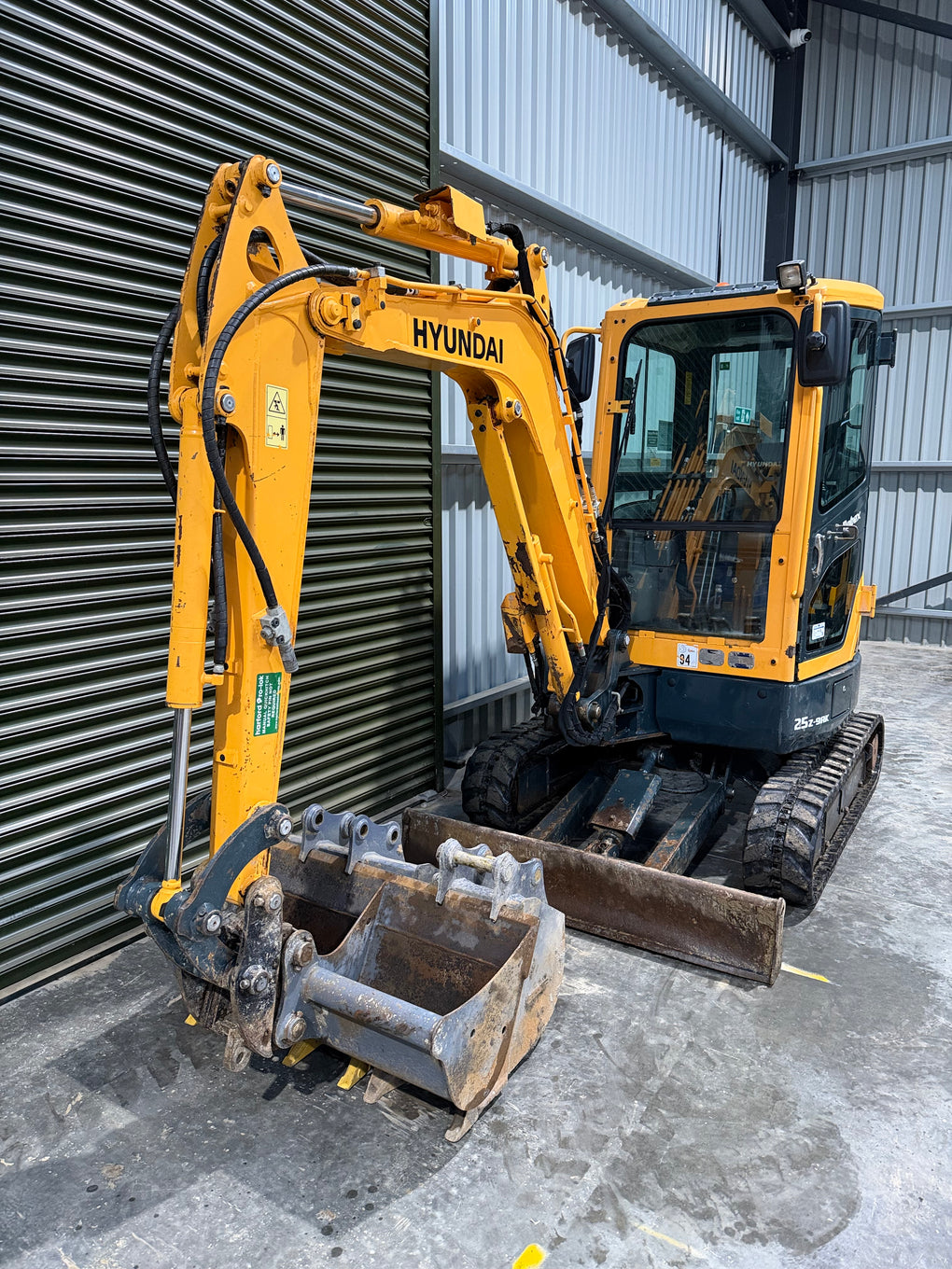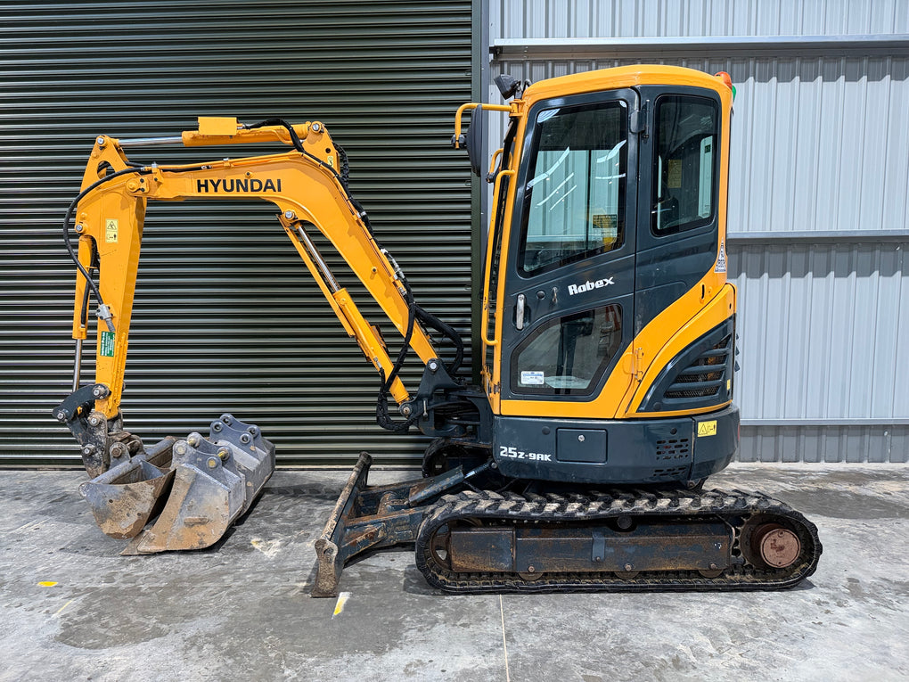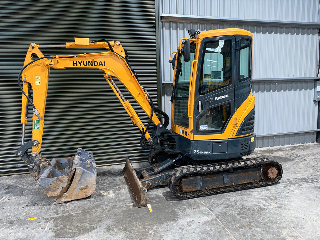 Hyundai R25Z-9AK. Year 2021. 1753 hours. Piped for hammer. Quick hitch and 3 almost new buckets. Kubota engine. Cab heater. Two speed tracks. Exact same machine as a Case CX26C which is a Hyundai badged as a Case.