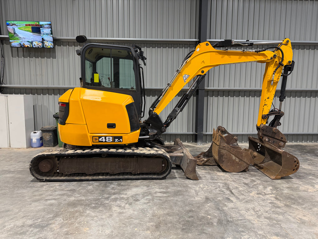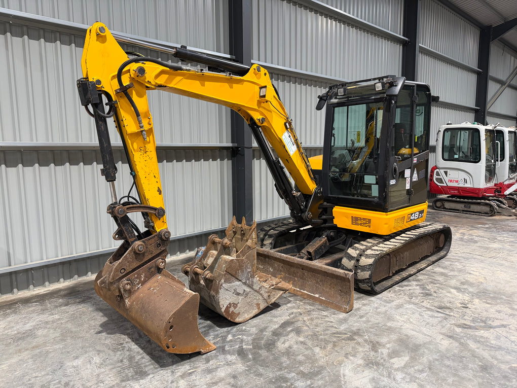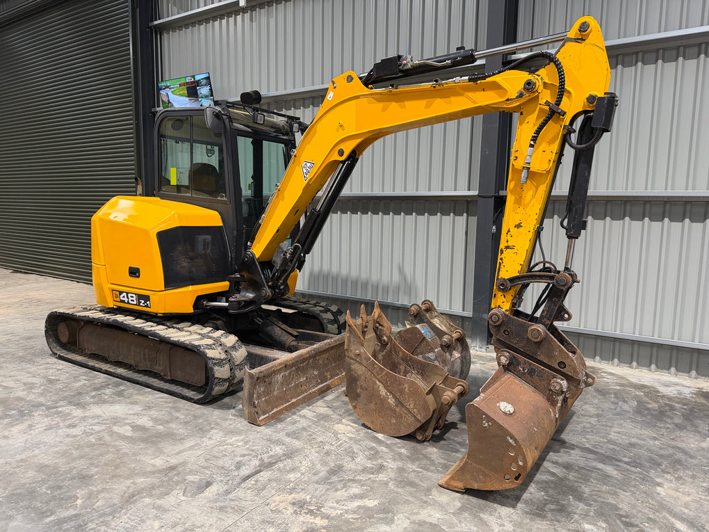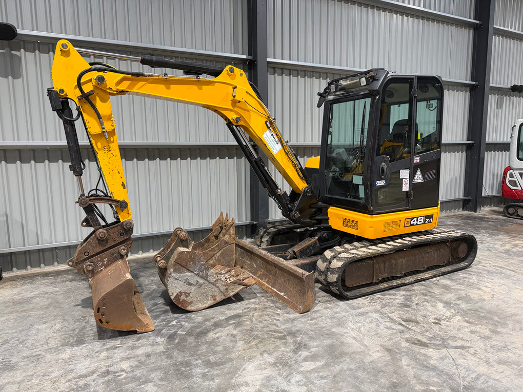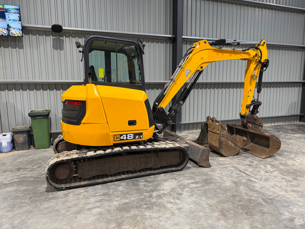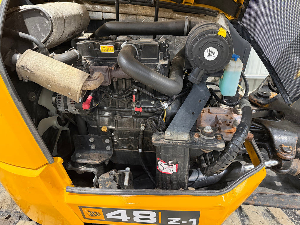 JCB 48Z-1. Year 2017. 4919 hours. Piped for hammer. Safety valves. Quick hitch and 3 buckets. Work lights and beacon. 1 owner machine from new. Very well serviced and maintained.