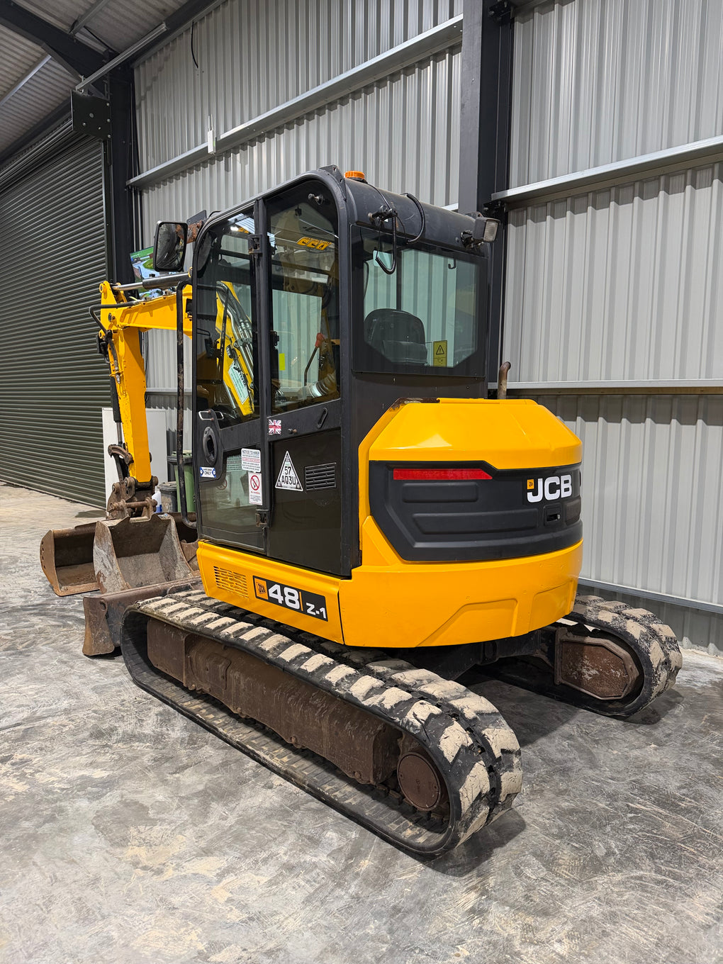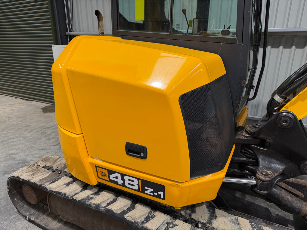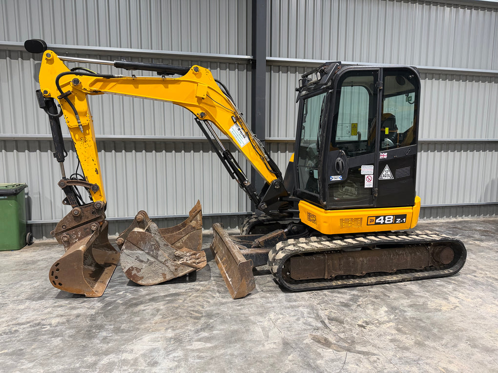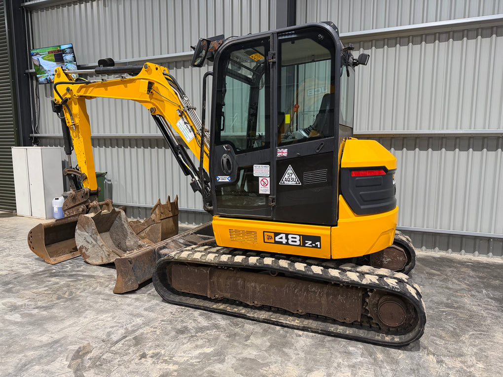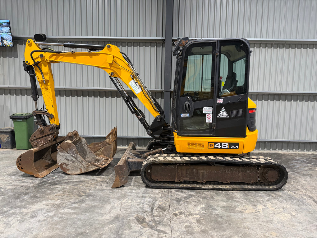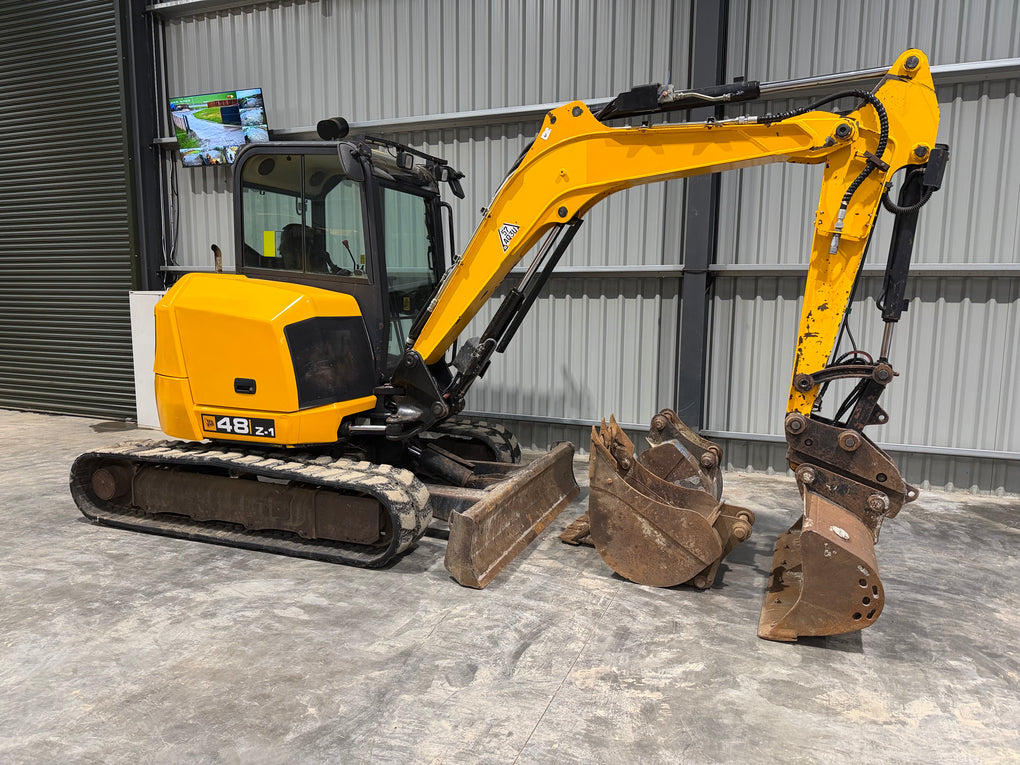 JCB 48Z-1. Year 2017. 4919 hours. Piped for hammer. Safety valves. Quick hitch and 3 buckets. Work lights and beacon. 1 owner machine from new. Very well serviced and maintained.