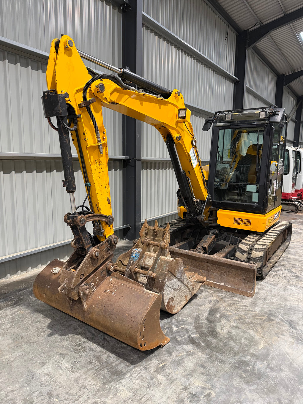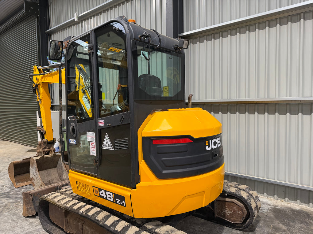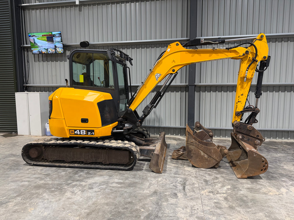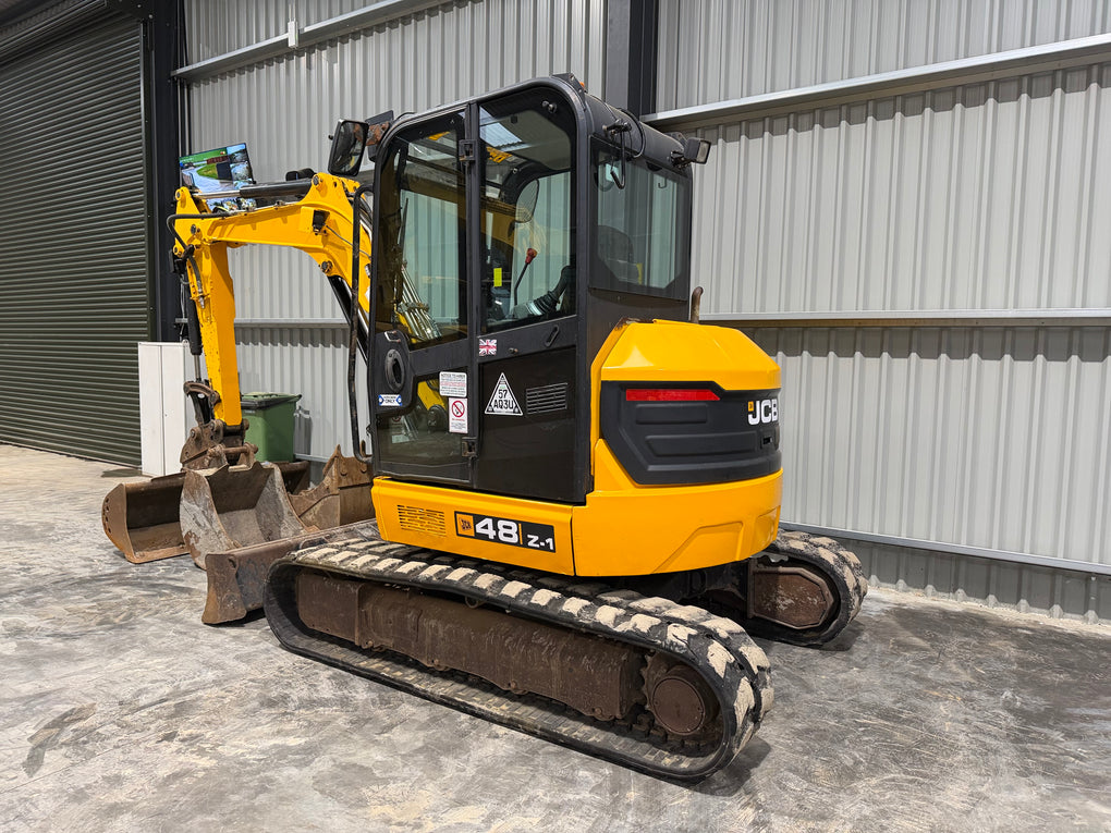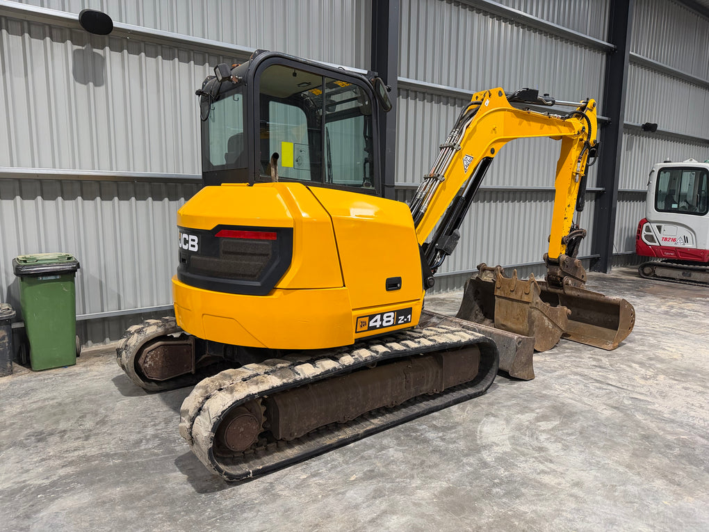 JCB 48Z-1. Year 2017. 4919 hours. Piped for hammer. Safety valves. Quick hitch and 3 buckets. Work lights and beacon. 1 owner machine from new. Very well serviced and maintained.
